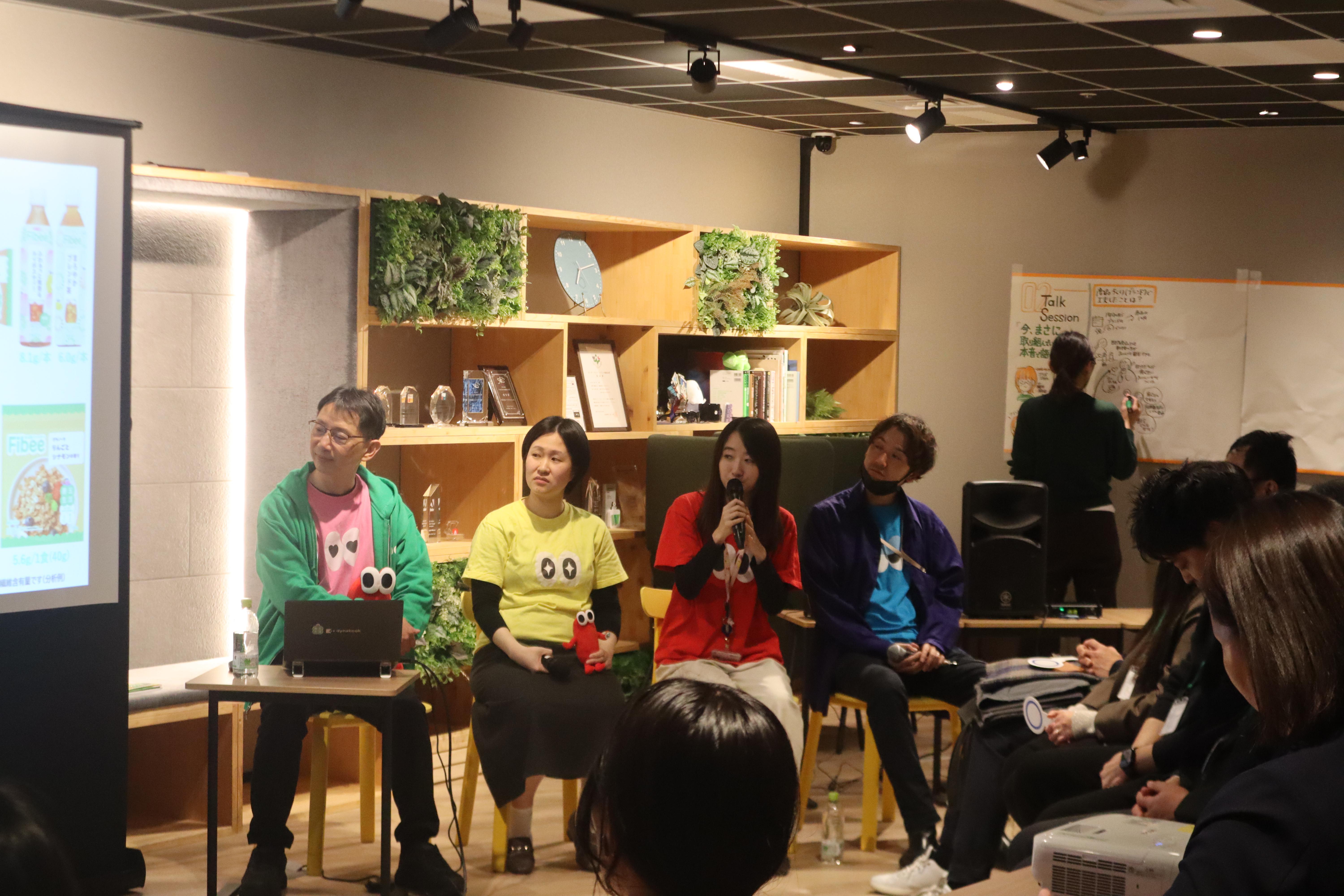 モデレーターの藤井氏(㈱コラボスタイル)の進行のもと、今まさに事業に取り組む中、商品開発やコミュニケーション担当など計3名の方にそれぞれ立場から工夫していることや難しさなどをテーマにトークセッションを行いました。