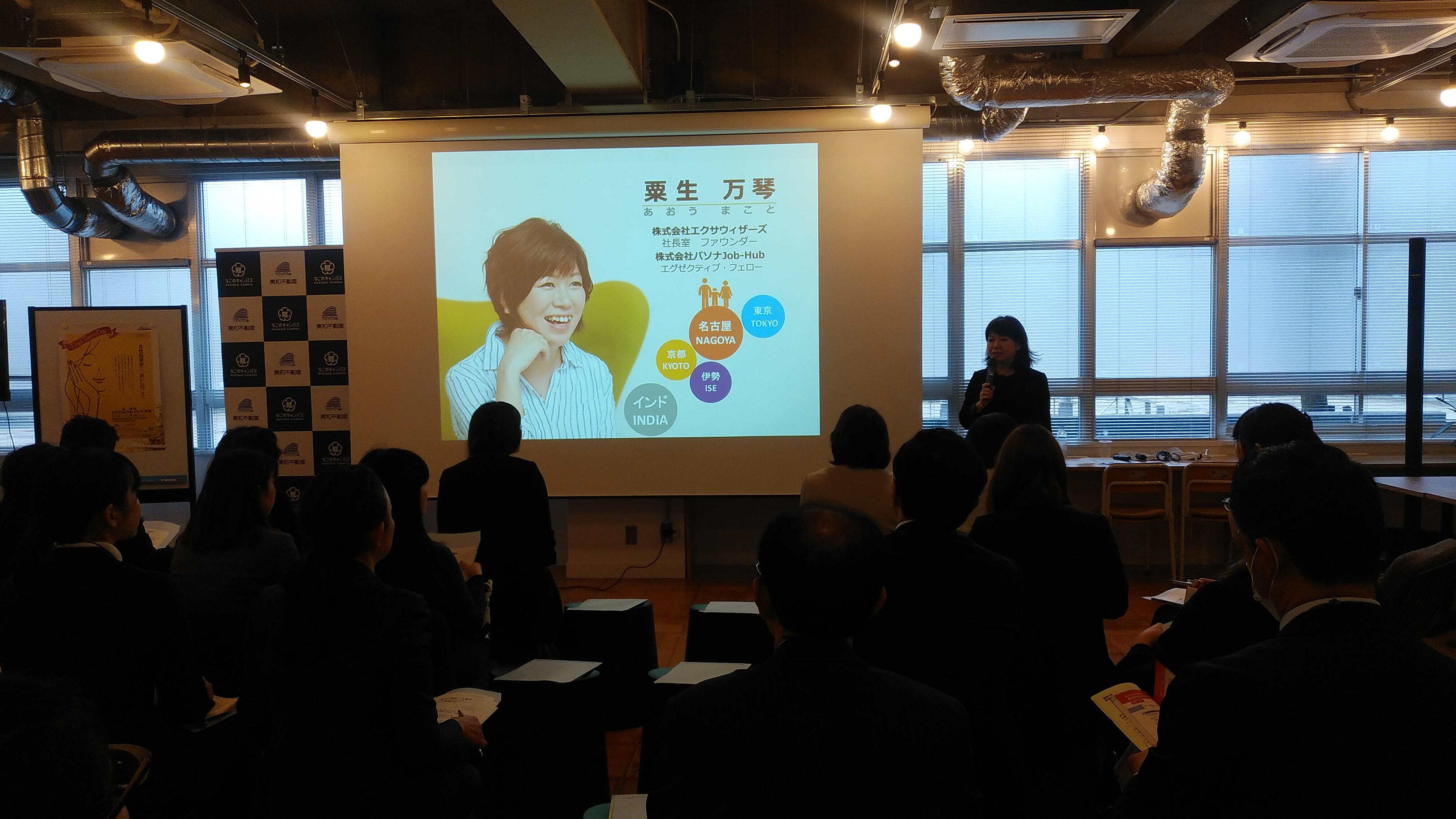 第1部では、㈱エクサウイザーズ社長室フェローとなごのキャンパス運営企画プロデューサーのパラレルワーク中の粟生万琴氏を講師にお招きし、『男女不問?!のマネジメント マネジメントに必要な3要素「計画性」「表現力」「合理性」、女性脳が活きる!』をテーマにご自身の経験も踏まえお話しいただきました。また、ご自身の子育てのなかで実践してきたことや、役立つツールなどもお話しいただきました。