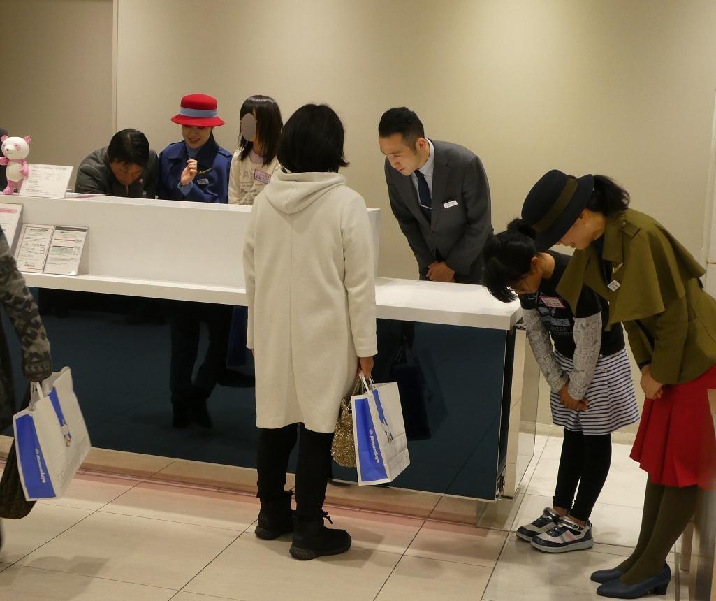 接客マナーの基礎練習を経て、案内カウンターで実際のお客様におもてなし。