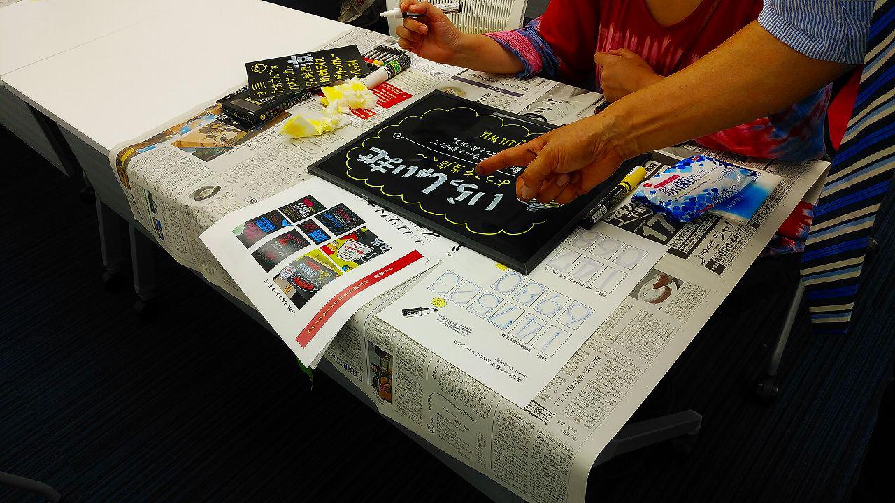 飲食店や小売店を対象に、自分でできる広告として人気のあるブラックボードの手描きPOP広告の基本から活用方法までを学ぶ実習中心のセミナーを名古屋商工会議所3階第1会議室にて開催しました。参加者18名。