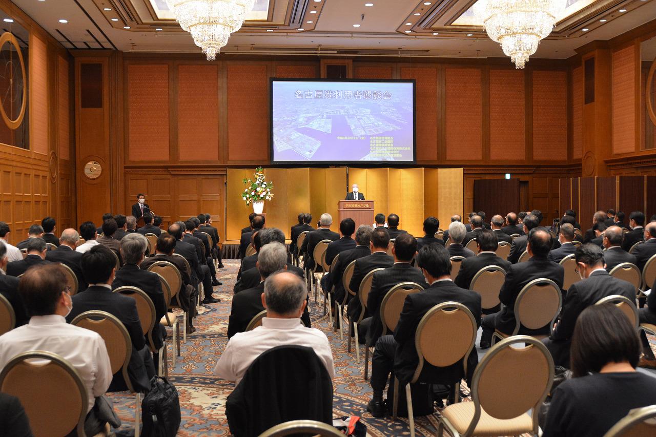 名古屋港では例年、一層の利用促進を図るため、名古屋港利用者懇談会を開催しています。新型コロナウイルス感染症の影響により2年ぶりの開催となりましたが、約100名の会場参加者とオンライン聴講者による懇談会となりました。