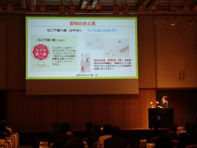 セミナー内では愛知県の魅力や産業施策を大村知事がプレゼンテーション。そのなかで地元の和菓子職人の手技を活かし、‘‘和菓子どころ名古屋‘‘の魅力を伝える新しい土産品として「なごや菓八菓」をご紹介いただきました。