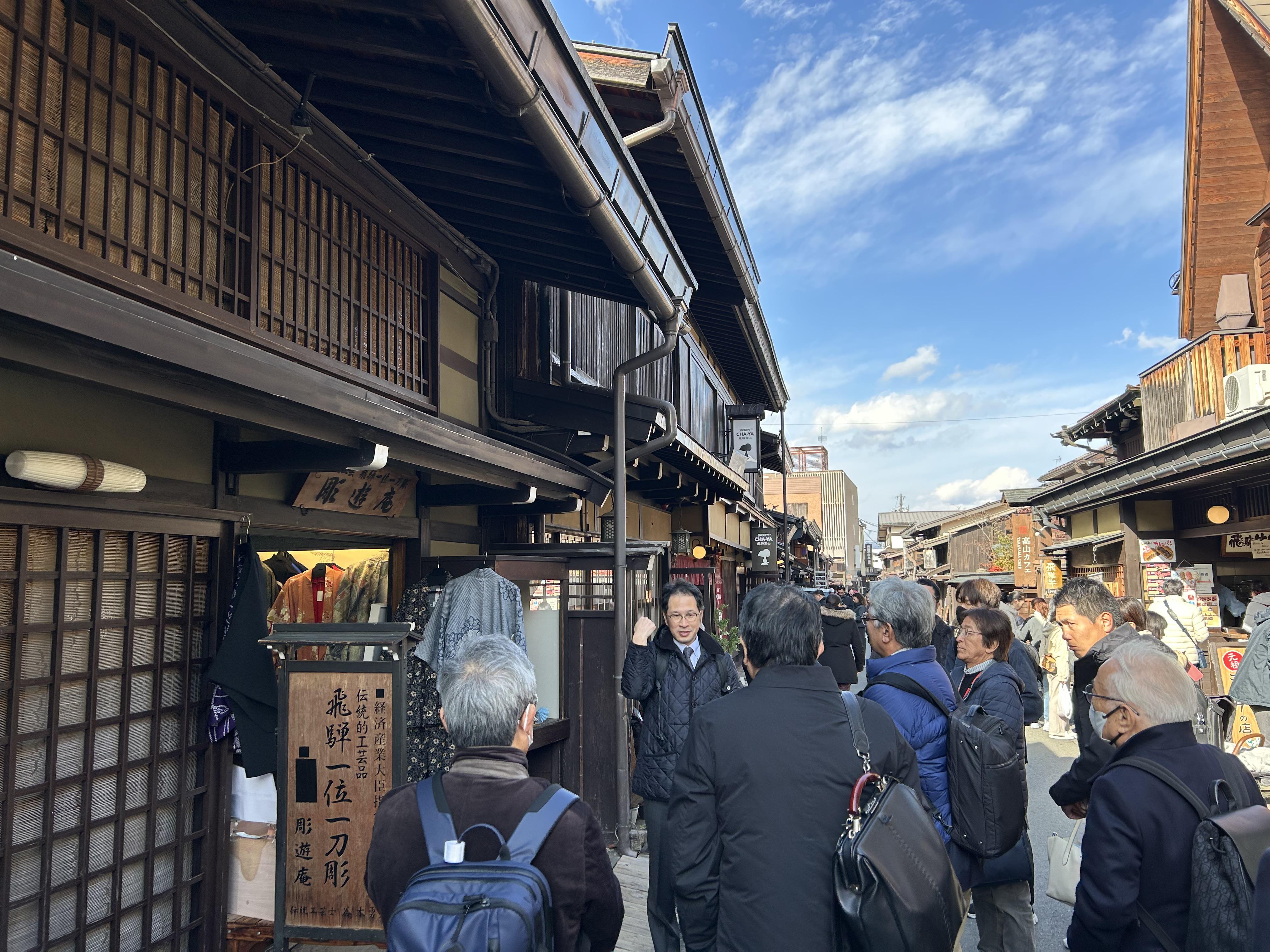 昨年度、生産性向上に先進的に取り組む中小企業を顕彰する「NAGOYA DX・生産性向上アワード2024」を開催しました。今年度は、アワード応募企業等の好事例を共有し、気づきや学びの機会とするセミナーや視察会などを4回計画しており、第3回目の本ネットワークは、同アワードのグランプリ受賞企業である「舩坂酒造店」の現場を視察するほか、AIカメラで得られた人流データを観光施策に活用する高山市役所の官民連携による地域DXの取り組みを学び、導入現場の一つである古い町並みを見学しました(参加者数20名)。