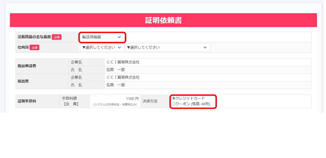 - 発給申請者、輸出者の欄には貿易登録の内容が表示されます。
