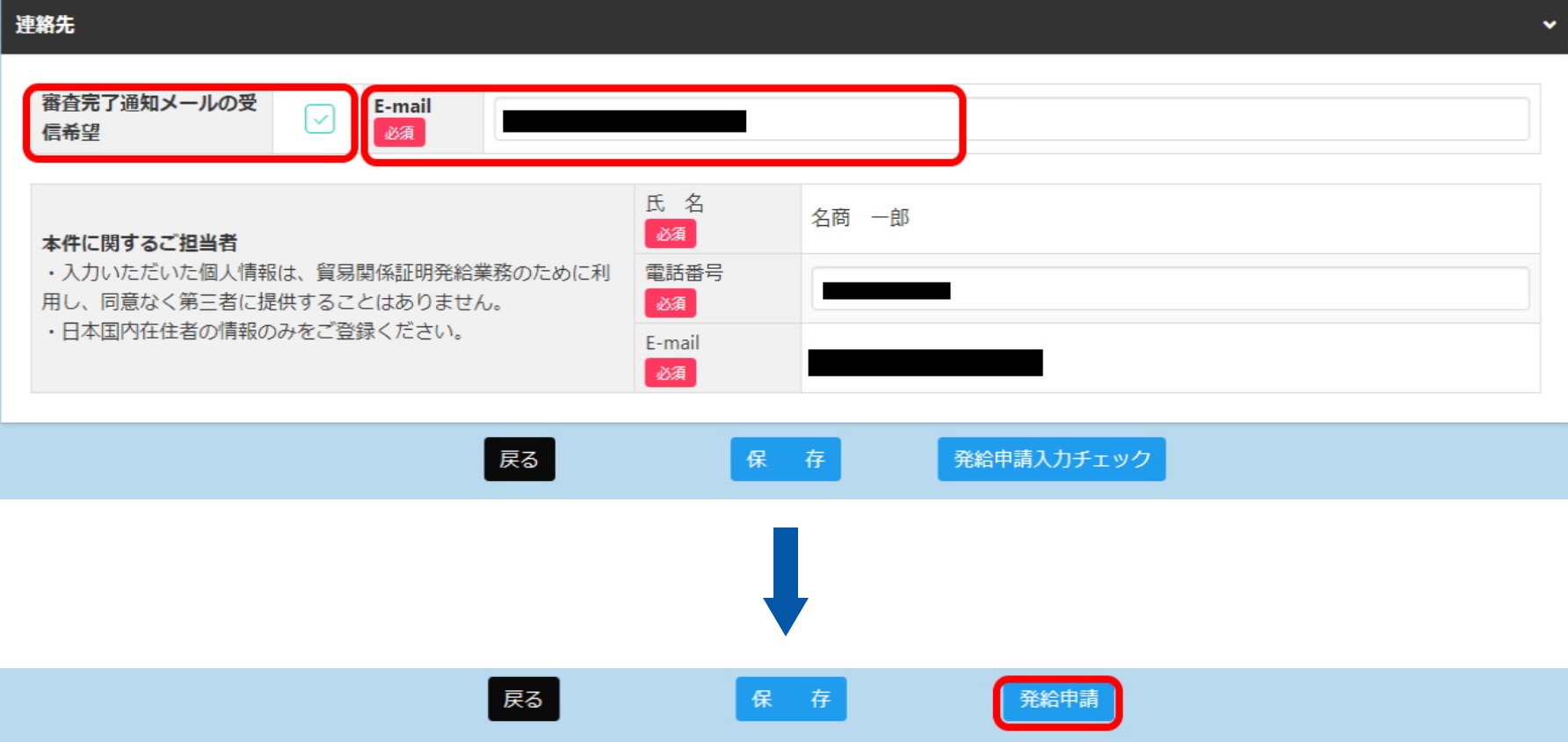- E-mail欄に記載するメールアドレスは、申請に不備等があり差し戻しを行った場合の自動メール送信先として使用します。