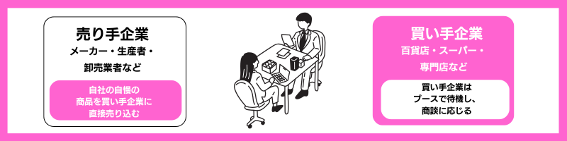 サプライヤーは当日受付後に予約した商談時間に、ブースに出向いて提案する「売り込み型」の商談会です。